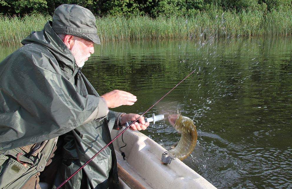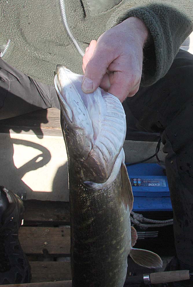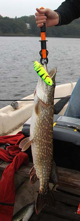 Herover ses Lipgrippen i funktion. Selv om gedden knokler voldsomt for at komme fri, er det kun sjældent at Lipgrippen mister grebet.