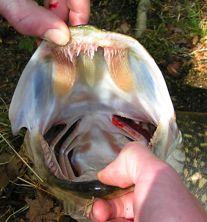 De store tænder i underkæben ser drabelige ud og hvis gedden ryster med hovedet imens man er uheldig at have fingrene i saksen, ja så..... Det kan du nok selv regne ud!