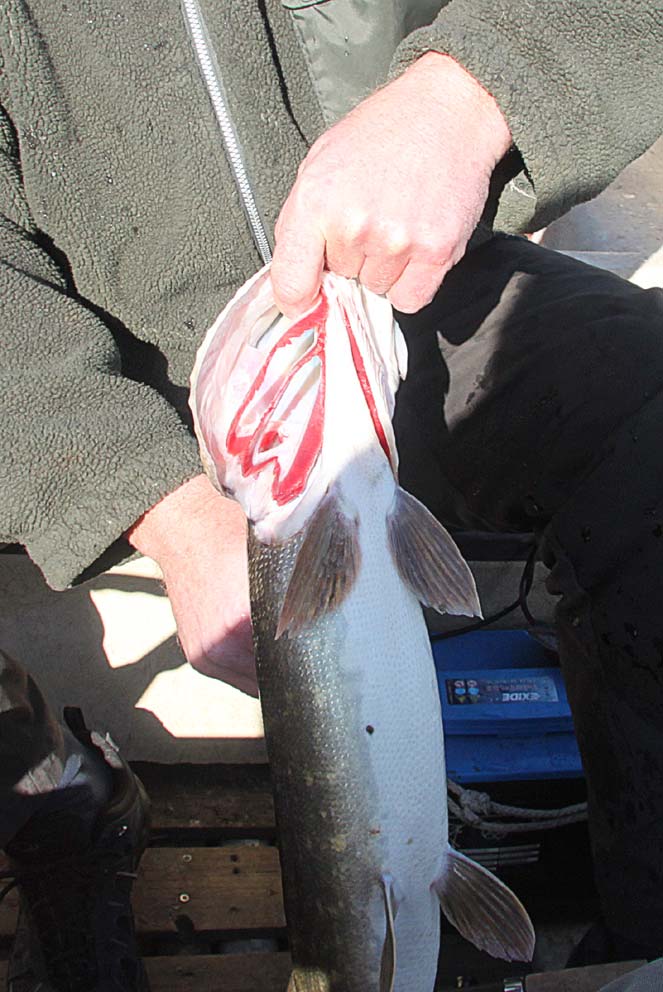 Krog skallen i overmunden og ved rygfinnen som vist herunder, når der bundfiskes, eller når man jævnligt spinner lidt ind.