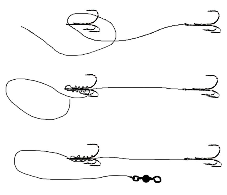 Start med at binde den ene trekrog fast i enden af forfanget. Monter den anden trekrog knudeløst som vist herunder.
