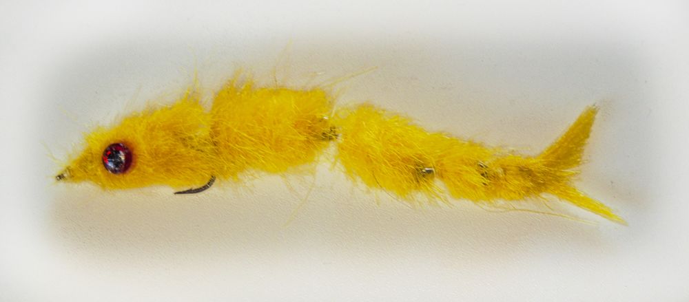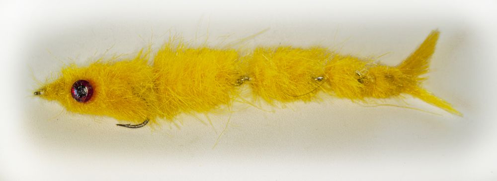 Den lidt underlige flue herover, er bundet på en række led i rustfri ståltråd. Den bevæger sig meget levende i vandet, men er noget tung at kaste med.