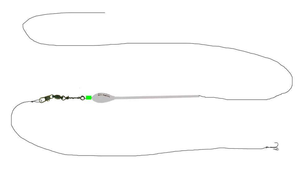 Min rig er vist herunder og som ovenfor, er afstanden mellem svirvlerne og krogen længere i virkeligheden, igen 60 - 180 cm.