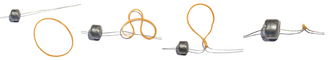 En mere klassisk metode til bundmede, er at anvende et gennemløbsbly og en svirvel eller en springring som stop. Skulle jeg anvende denne rig, ville jeg sikkert bruge en gummistopper, så det er let at justere længden på forfanget. Nedenfor er der vist hvordan man let og hurtigt, laver en gummistopper af en almindelig elastik. Måske er det nødvendigt at montere 2 gummistoppere efter hinanden, for at det kan holde vægten fra blyet i kastet, men det finder du selv ud af.