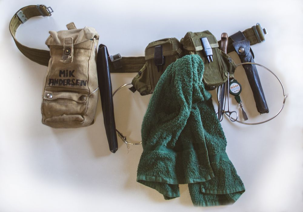 I lang tid, brugte jeg en fiskevest, men vurderede at den blev for varm at gå med om sommeren. Minder og erfaringer fra min tid i Forsvaret, fik mig til at gå ind på et overskudslager og købe et basisbælte, samt nogle passende tasker. Af det sammensatte jeg et fint basis til P&T, som jeg supplerede med nogle ekstra skeder af læder, så jeg fik plads til alt det nødvendige materiel.