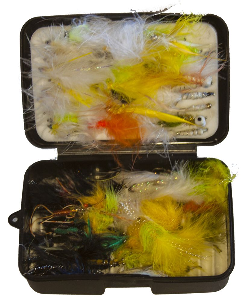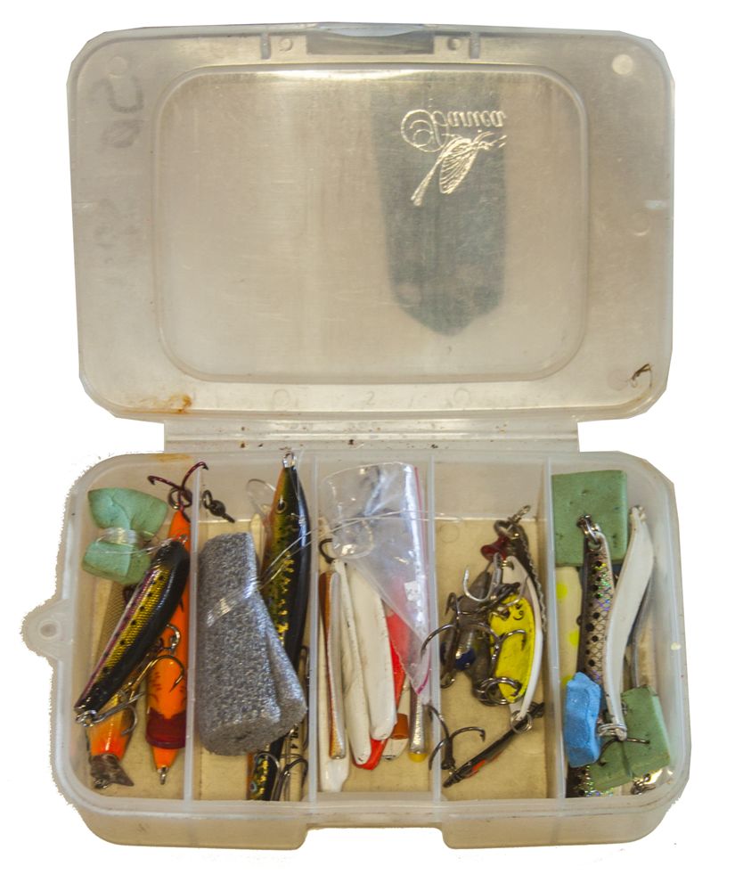 I magasintaskerne i mit basis, bærer jeg et par små grejbokse. -En til hårde spinneagn og en til fluer. -Det er et par værre rodekasser, men det fungerer.