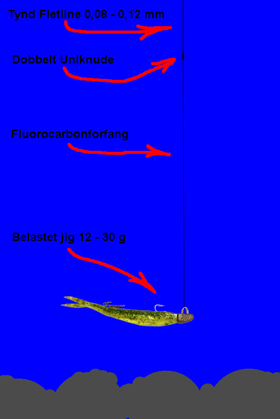 Det skal være en fletline fordi at den skal kunne formidle de oplysninger som bunden og fiskene giver fra sig ved berøring. Det vil sige at man kan MÆRKE hvor hård bunden er, når jiggen dunker imod. Det kræver lidt øvelse, men det kommer egentligt ret hurtigt.