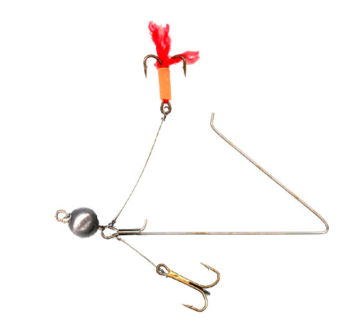 Endelig kan man kombinere tingene og montere en trekrog i hovedenden efter et stykke kuglebly. Dette forbindes med krogen i O-ringen, via et stykke fletline som trækkes igennem jigkroppen med en agnnål. Denne rig har dog nogle ulemper, da den ikke er særligt solid og gerne vil lave bundhug. Riggen vises på illustrationen herunder.