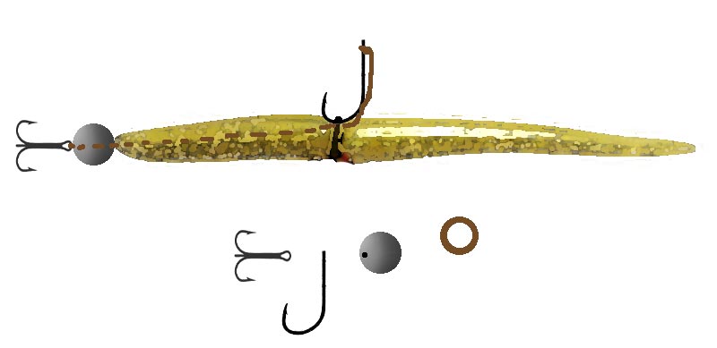 Fisker man med jigs med fiskeform, stikkes krogen blot igennem kroppen, men anvender man mere ormelignende slanke jigs som eksempelvis "Slug-Go" eller "Bubble Worm", vil jeg anbefale at montere krogen i en O-ring som trækkes udenpå kroppen, da holdbarheden ellers vil være ret ringe.