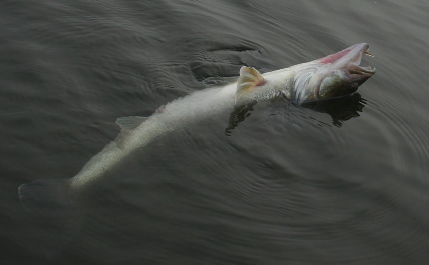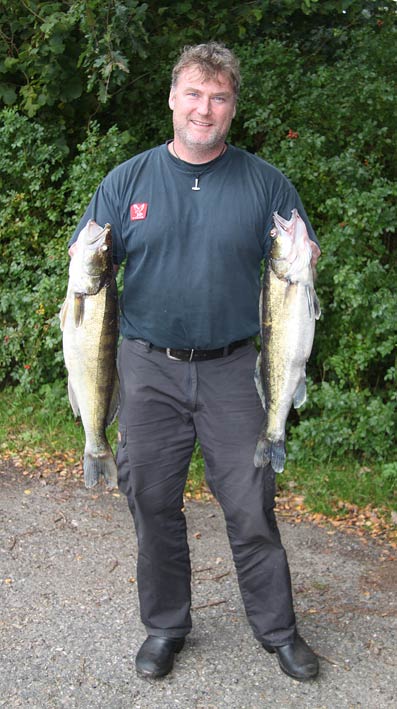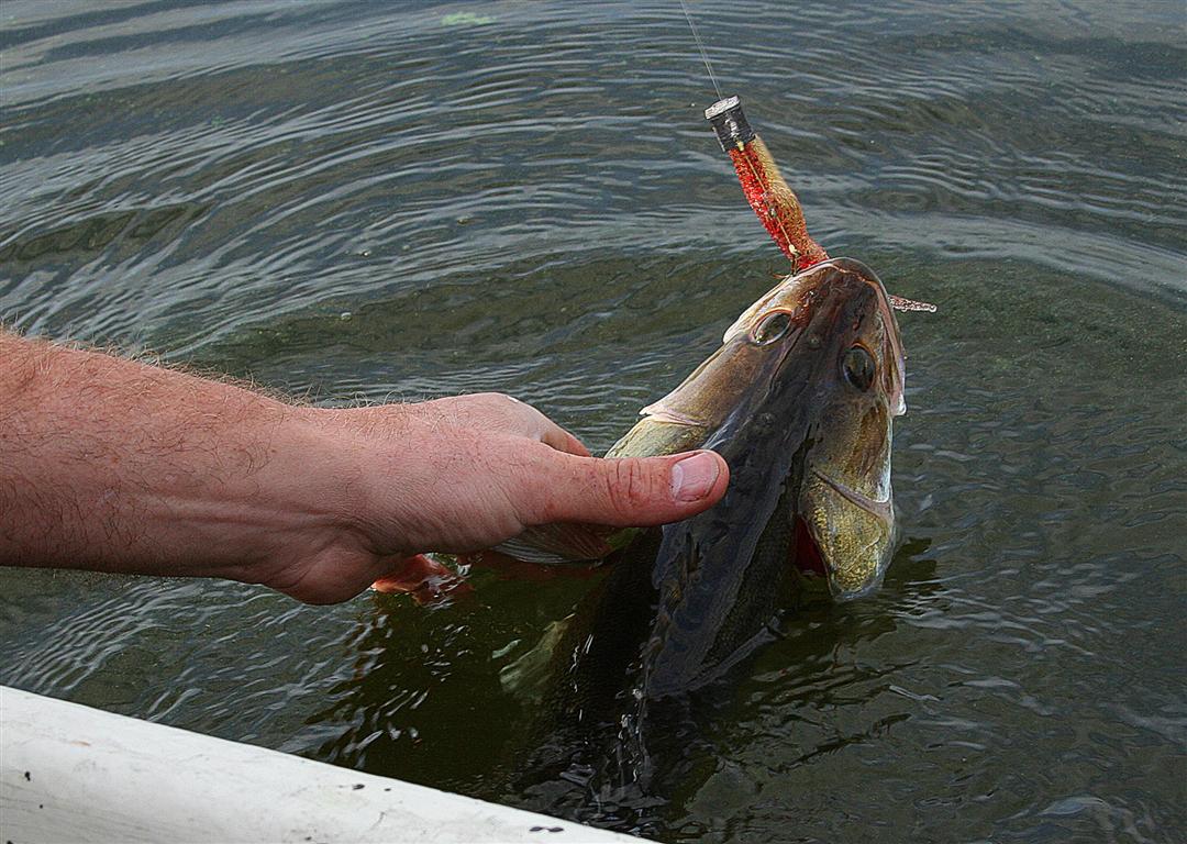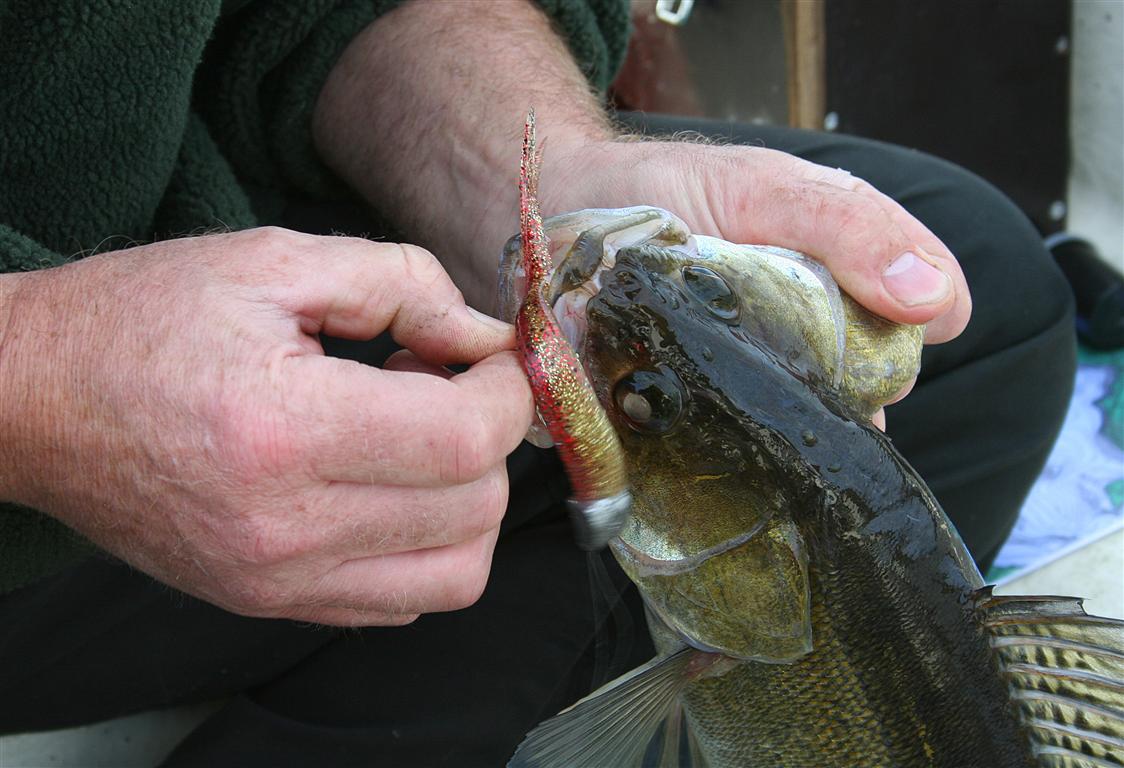 Sandarten her afkroges og sættes fri igen. Bemærk karpelusene på sandartens hovede. -Dem plejer jeg at vifte af, som en slags tak for kampen, inden genudsætning.