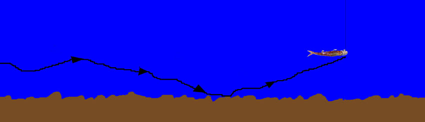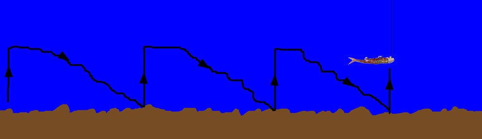 Vertical Jigging i sin enkle form med en belastet jig i enden af linen. Jiggen arbejder helt nede ved og på bunden. Det er denne metode jeg beskæftiger mig mest med og er da også det jeg primært beskriver i det efterfølgende.