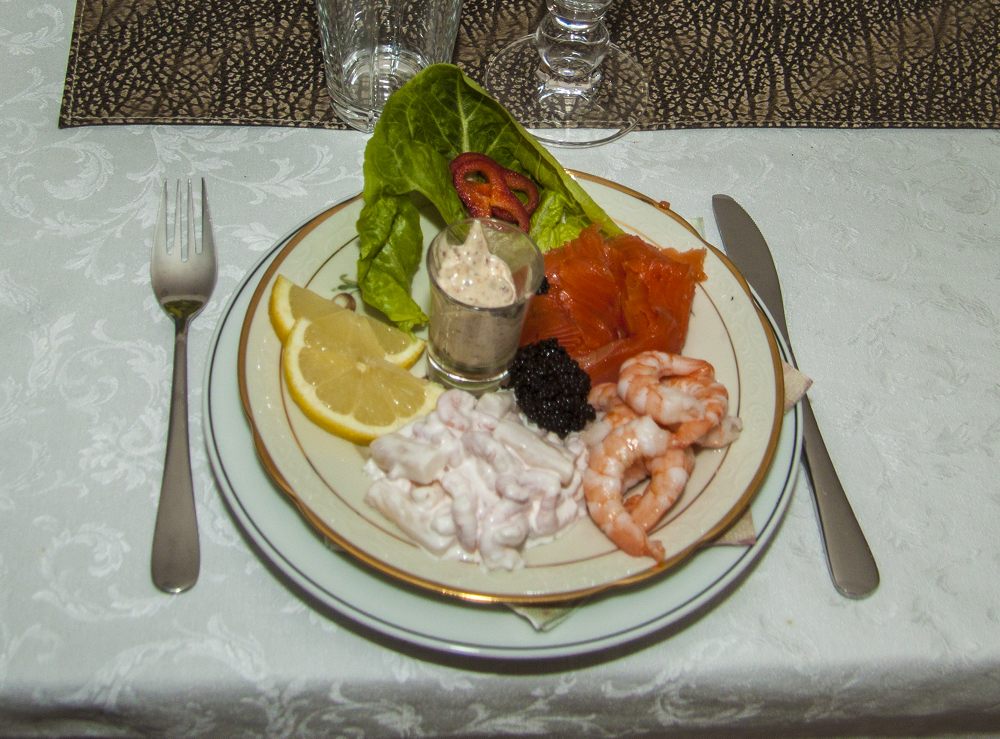 Fiskeretter bliver ofte anvendt som forretter. Platten herover er et typisk eksempel, i hvert fald her i huset. Den består af en hjemmelavet rejesalat, lavet af Launis rejer i lage, et glas fine asparges og noget hvid mayonaise. Dertil store kogte Vanamairejer i lage, koldrøget ørred, sort kaviar, hjemmerørt chili/peber mayonaise, et salatblad, lidt peberfrugt og en skive citron. Som tilbehør, serverer jeg ofte hjemmebagte ciabattastykker og smør.