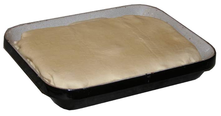 Dejen rulles ud i rigeligt mel, til en rektangulær pizzabund.