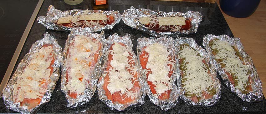 Forrest til venstre: Ørredfileter påført Aromat, Aioli (hvidløgsmayonnaise), flødeost med hvidløg, lidt revet mozzarella, samt et par syltede hvidløg.