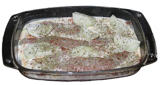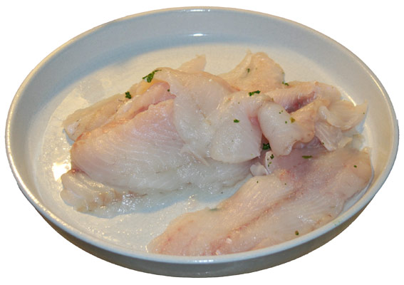 Der placeres et stykke sandartfilet i fadet, som krydres med Aromat.
