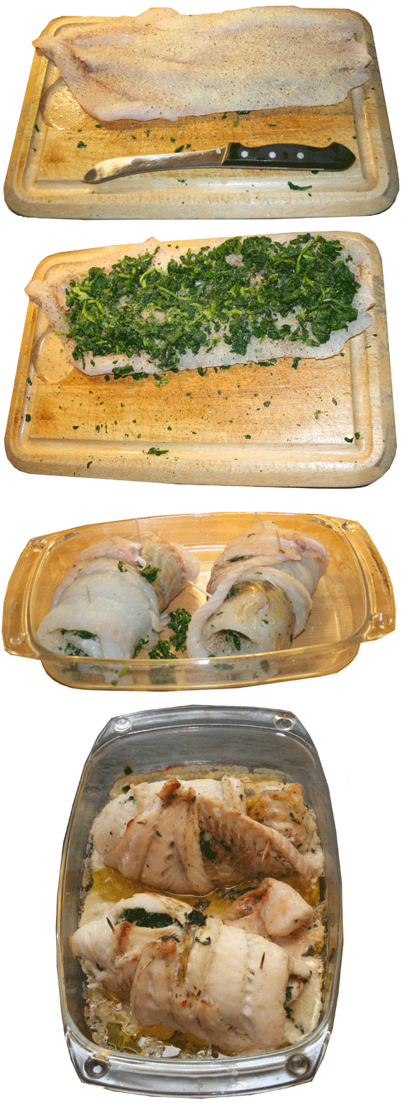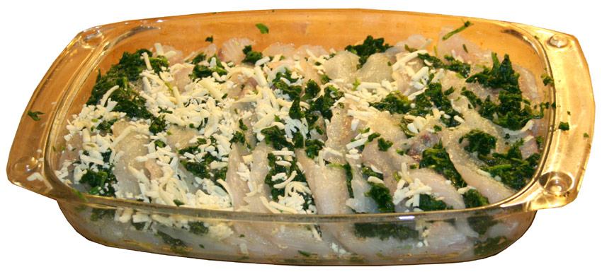 Sådan fortsætter man til fadet er fyldt med tynde filetstykker med Aromat, spinat og ost imellem.