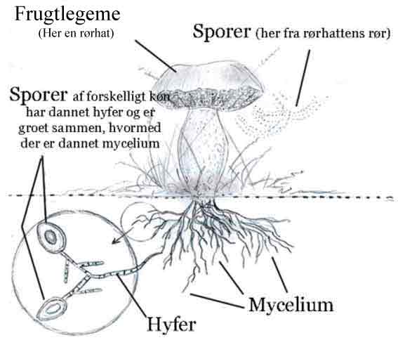 Finder vi en rørhat eller en fluesvamp i skoven, er det altså ikke svampen vi har fundet, men svampens frugtlegeme (mycin). Frugtlegemet regnes for at være ca. 1/10 af hele svampen. Frugtlegemet er dannet med det formål, at svampen gennem dette kan formere sig. I frugtlegemet dannes der milliarder af sporer, som bliver ført videre t il andre steder med hjælp fra luftstrømme. Hvis to sporer af forskellig parringstype lander tæt på hinanden og spirer, kan disse vokse sammen og danne et nyt mycelium, som så senere kan danne nye frugtlegemer osv.