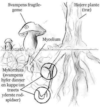 Endelig er der mykorrhizadannerne. De samarbejder med et træ (en højere plante), således at svampens hyfer danner en kappe omkring de yderste rodspidser på træet. Mykorrhiza betyder svamperod. Mykorrhiza-forbindelsen skabes til gavn for både svampen og træet. Dette kaldes med andre ord for en mutualistisk symbiose. Svampen opsamler, med sit fint forgrenede mycelium, vand og næringssalte, som den sender op til træet. Træet, der er i stand til at danne sukker, sender dette og andre organiske forbindelser ned til svampen. Samlivet er nødvendigt for begge parter, så man finder f.eks. ikke en rørhat uden dens makkertræ. Rørhattene, fluesvampene og kantarellerne er alle eksempler på mykorrhizadannere. Langt de fleste spisesvampe er mykorrhizadannere, men fx findes mange champignoner på åbne græsarealer. Her er der ingen træer, som de kan danne mykorrhiza med, hvilket ikke er nødvendigt for disse svampe.