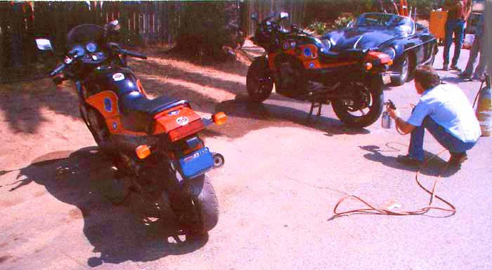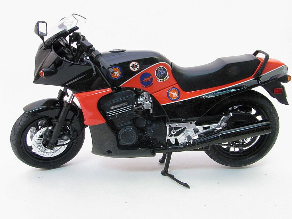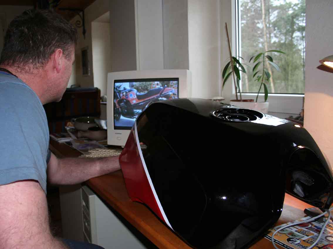 Jeg var medlem af et entusiastforum i England: http://gpz900r.org. Desværre blev det nedlagt, da ophavsmanden blev syg af kræft og ikke kunne overkomme at køre siden videre. Alle her ejede en GPz og har hver sin indgangsvinkel til den. Det var et utroligt nyttigt forum, hvor alle var indstillet på at hjælpe hinanden og her var der naturligvis også nogle der havde malet deres GPz "Top Gun style". Faktisk har jeg set flere billeder af cykler, hvor man har prøvet at efterligne den, men ingen af dem lignede helt. Til gengæld fik jeg blod på tanden og ændrede mit mål til at kopiere lakeringen helt og ikke kun næsten. Dermed opstod der et problem, for der var ingen der kunne levere et eneste godt billede af cyklen. Her var sgu en udfordring og jeg begyndte en jagt på nettet efter billeder, samtidig med at jeg kiggede de filmsekvenser med cyklen igennem, billede for billede. Jeg havde vel brugt mere end 100 timer på projektet, da der endelig kom et gennembrud: Jeg fandt frem til den mand der havde leveret cyklen (cyklerne) til filmen i 1985. Han hedder Mr. Chris Dolan og stadigvæk bosiddende i San Diego og er stadigvæk motorcykelgal, selv om han har solgt sit værksted. En særdeles hjælpsom mand, der uden videre sendte billeder og informationer over til mig af flere gange. Nu vidste jeg pludselig hvordan cyklen så ud, eller mere korrekt: Hvordan CYKLERNE så ud, for der var 2 og for at det ikke er løgn er de ikke engang ens!?!?!? Det gav jo en god forklaring på hvorfor jeg ikke kunne få det til at hænge sammen, da jeg kiggede filmen igennem, billede for billede. Nå... Jeg bestemte mig for et design som jeg mener er det mest dækkende.