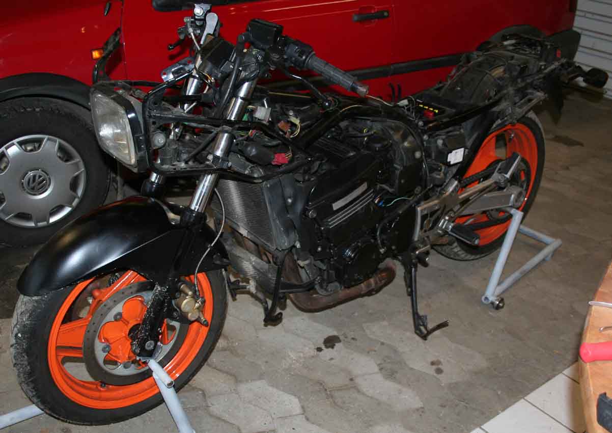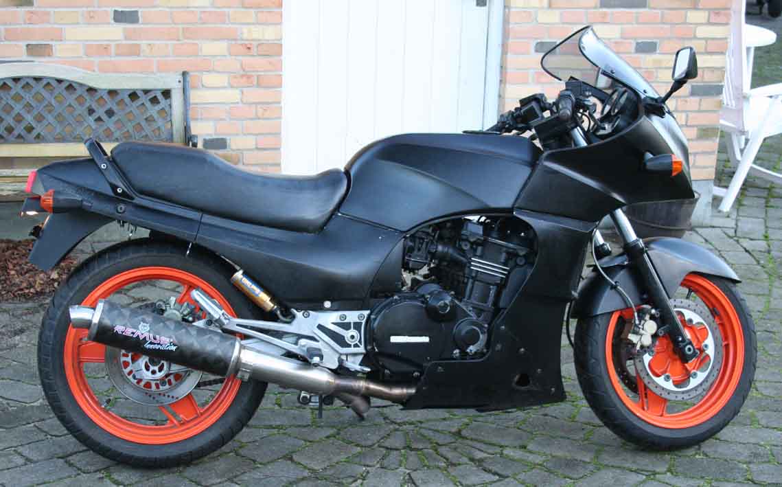 Da jeg købte den, så den ud som på billedet ovenfor. Af negative ting var at den ikke helt stod original, da bagsvinger, forgaffel, forskærm og hjul, er fra en ZX10. Bagskærmen er savet af og udstødningen var skiftet til en 4 i 1, men værst af alt var dog at den var overmalet med SPRAYDÅSEMALING. Desuden var akslen til gearpedalen i stykker. Af positive ting var at den var billig og med en nyudskiftet motor, kan den nu nok køre langt endnu. Kædekit og dæk var bestemt heller ikke slidt op. Desuden var monoshockén udskiftet med Ölihns bud på samme og er en ret dyr, men også meget bedre løsning. Desuden må jeg erkende at den med de bedre dæk, dæmper og bremser, simpelthen kører bedre end den originale. - Jeg fik de originale dele med i købet, men jeg har valgt at bibeholde den som den var.