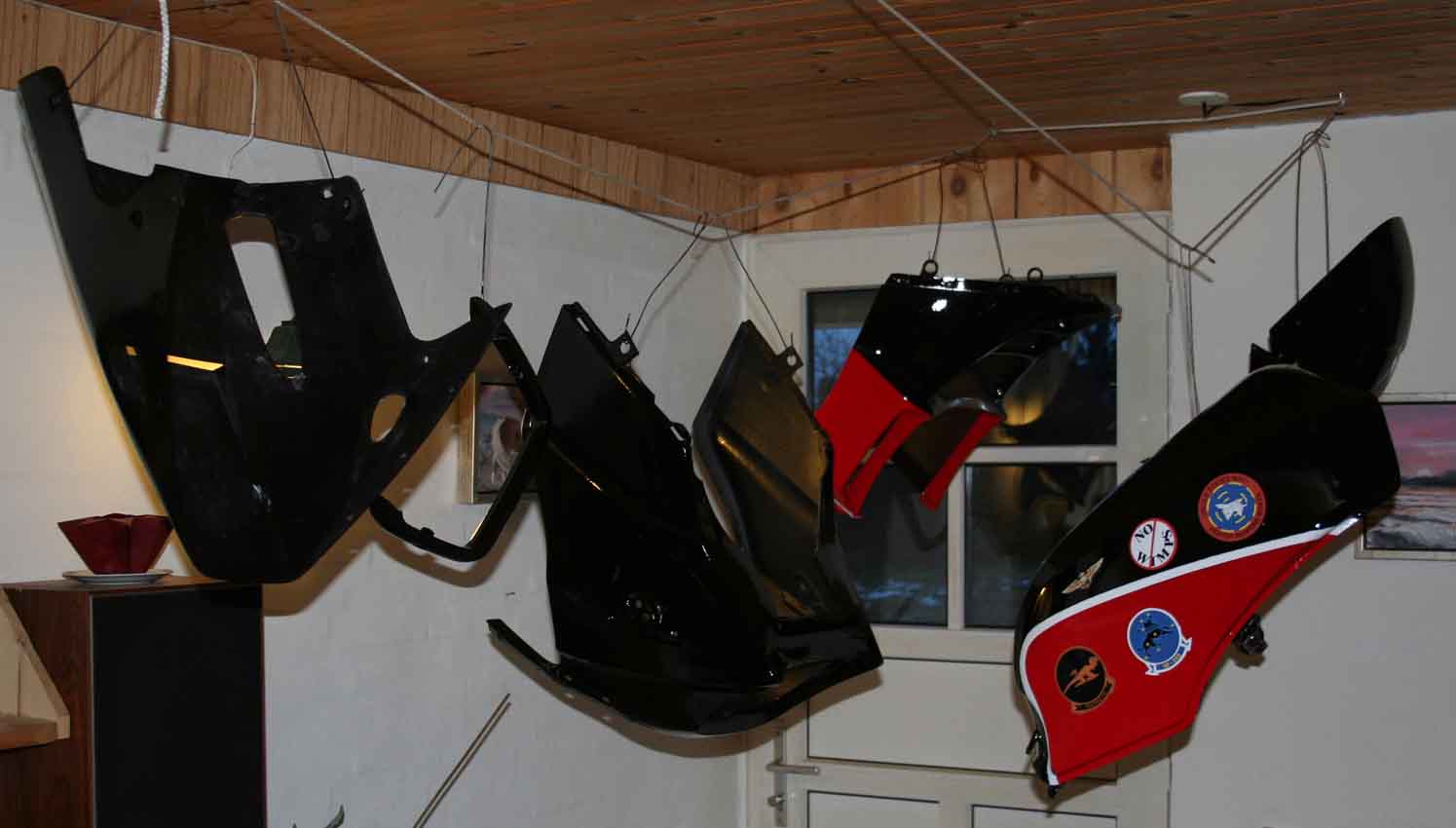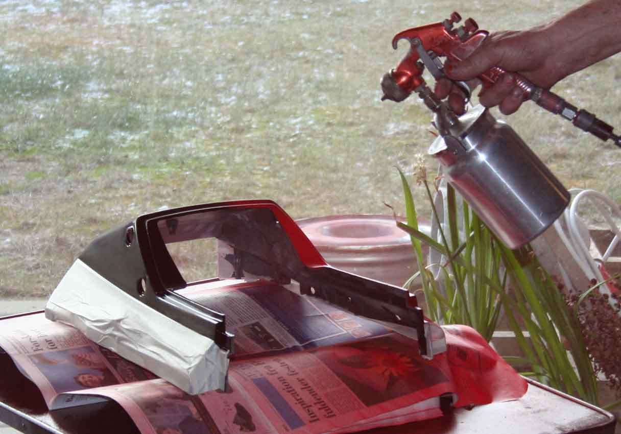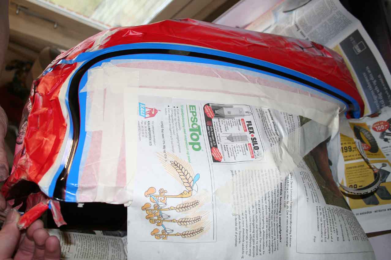 Vi nåede op over bakken, da jeg fik købt de rigtige materialer. Jeg har en rigtig god Sagola-sprøjte, så det gik egentlig meget godt. Der hvor man kan se at det er et amatørarbejde, er langs striberne, hvor kanten er lidt grov nogle steder fordi at malingen er rendt ind under tapen. Ellers er arbejdsgangen nogenlunde sådan: Spartel, Grundmaling, Filler, Sort, Rød, Hvid, Mærker, Klarlak og Klarlak igen...
